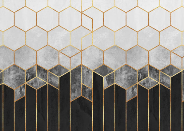 Ett sofistikerat geometriskt mönster med hexagoner i eleganta koltoner. Denna moderna tapet skapar en urban och stilren atmosfär med sina perfekt formade sexkanter i olika nyanser av grått och svart.