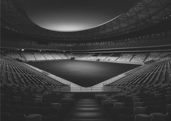 Cathedral of Football representerar fotbollens själ och passion - perfekt för dig som älskar sporten och vill ha ett konstverk som fångar både dess storhet och melankoli. Den tidlösa svartvita estetiken gör att tapeten passar i alla hem.
