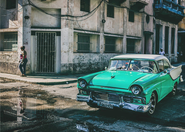 En klassisk bil i turkos glider genom Havanas gator, där vattenpölar speglar den färgstarka omgivningen. Bilden fångar den nostalgiska känslan av Kuba – en plats där tiden tycks stå stilla och varje hörn berättar en historia.