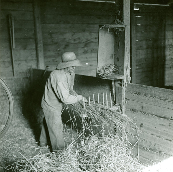 Detta svartvita fototapet fångar en tidlös scen från lantbrukets guldålder. Bilden visar den traditionella tröskningsprocessen där säd separeras från ax, en fundamental del av jordbrukets historia som format våra samhällen i generationer.