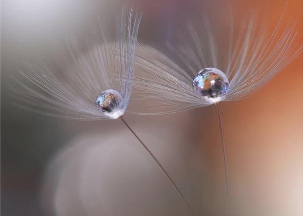 En glittrande daggdroppe vilar i en frökorg, omgiven av mjuka duntufs som reflekterar ljuset. Bilden är tagen i makro och fångar den ömtåliga skönheten i naturens minsta detaljer – ett ögonblick av ren magi där vatten och ljus skapar ett drömliknande bokeh.