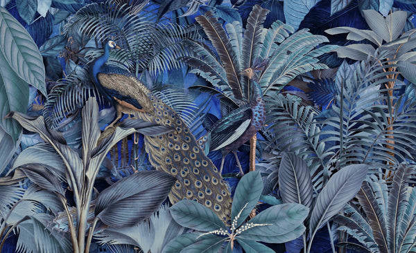 Denna fototapet för dig in i djungelns hjärta med sina majestätiska tropiska fåglar och frodig vegetation. De rika blå tonerna och detaljrika fjäderdräkterna skapar ett starkt blickfång som förvandlar vilket rum som helst till en exotisk oas.